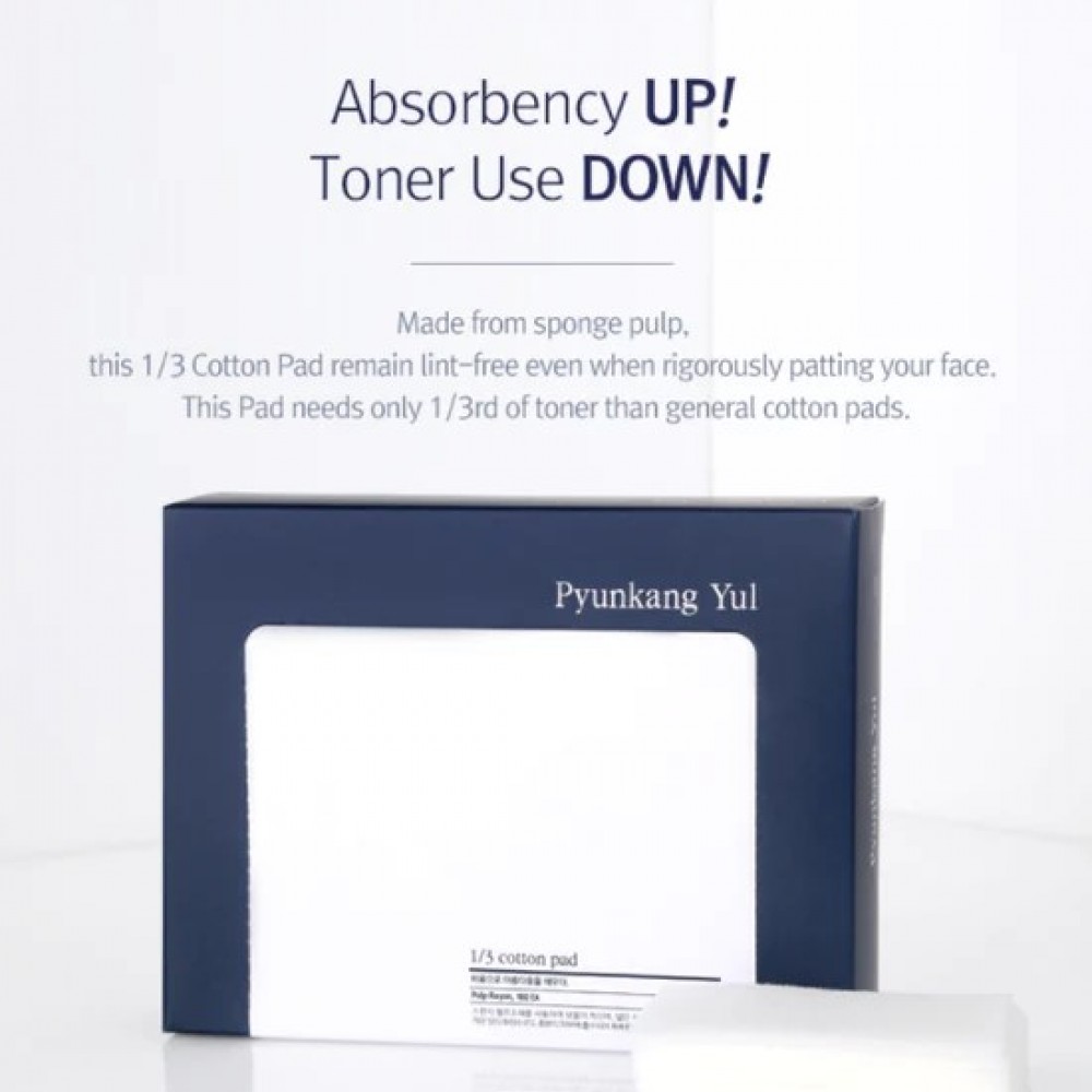 Τα Pyunkang Yul 1/3 Cotton Pads - 160 τμχ είναι κατασκευασμένα από ένα μοναδικό μείγμα σφουγγαριού και ρεγιόν και δεν αφήνουν χνούδι κατά την χρήση τους όπως οι συμβατικοί δίσκοι από βαμβάκι. Το πάχος του Cotton Pad είναι σταθερό και προσκολλάται εύκολα στο δέρμα μαζί με τις καμπύλες του προσώπου. Απορροφά ποσότητα του toner 1/3 λιγότερη σε σύγκριση με την ποσότητα που απορροφούν οι συμβατικοί δίσκοι από βαμβάκι, έτσι με αυτό τον τρόπο εξοικονομούμε ποσότητα και το δέρμα μας λαμβάνει την απαιτούμενη ποσότητα για αυτό.
