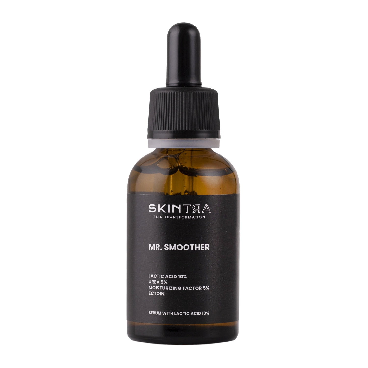 SkinTra - Mr. Smoother - ένας ορός σχεδιασμένος για ξηρές και τραχιές επιδερμίδες που χρειάζονται εντατική ενυδάτωση, απαλότητα και λείανση. Το προϊόν έχει σχεδιαστεί για χρήση στο πρόσωπο, το σώμα, την περιοχή των ματιών και τις οικείες περιοχές. Το κύριο συστατικό του ορού, 10% γαλακτικό οξύ , επαναφέρει την απαλότητα, την απαλότητα και την ενυδάτωση σε ξηρές επιδερμίδες με διαταραχές κερατινοποίησης. Επιπλέον, το οξύ αυτό χαρακτηρίζεται από ένα μεγάλο μόριο, το οποίο χωρίς να προκαλεί ερεθισμούς ρυθμίζει τη διαδικασία απολέπισης της επιδερμίδας, συμβάλλοντας στη μείωση των ατελειών και του αποχρωματισμού. Η σύνθεση περιλαμβάνει επίσης: 5% ουρία, ενυδατικό παράγοντα και εκτοΐνη που έχουν ιδιότητες δέσμευσης νερού στην επιδερμίδα, ενισχύοντας έτσι την ενυδατική δράση, προστατεύοντας το δέρμα από ξηρότητα και ερεθισμούς. Η φόρμουλα του προϊόντος έχει ελαφριά, υδαρή υφή, κάνοντας τον ορό να απορροφάται γρήγορα και να μην αφήνει λιπαρό στρώμα στο δέρμα. Το προϊόν έχει βέλτιστο pH περίπου 3,5 και μπορεί να χρησιμοποιηθεί από έγκυες και θηλάζουσες γυναίκες.